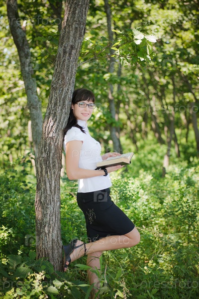 Девушка в деловом костюме читает книгу в лесу