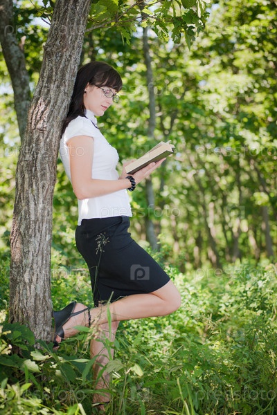 Девушка в деловом костюме читает книгу в лесу