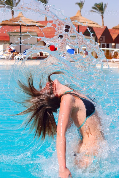 Девушка выпрыгивает из бассейна