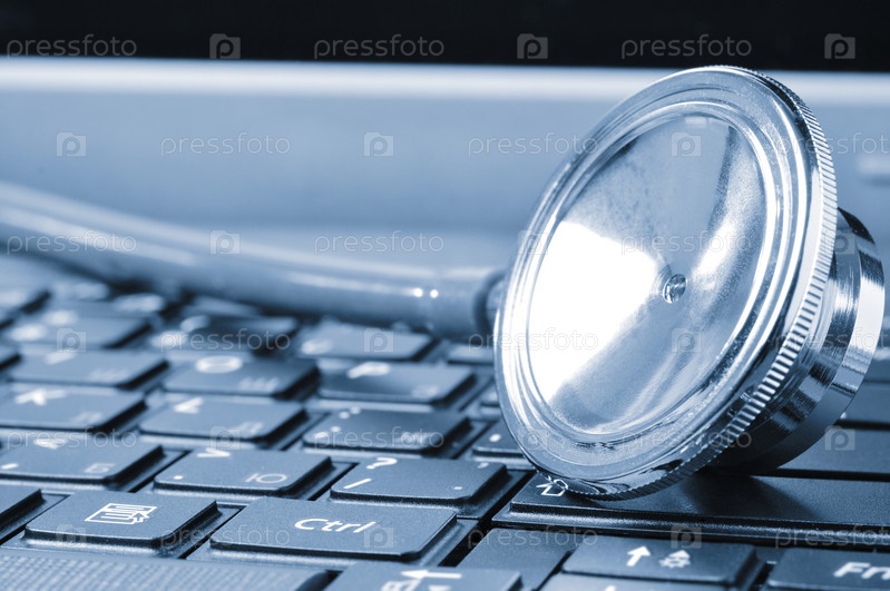 Стетоскоп на клавиатуре компьютера крупным планом