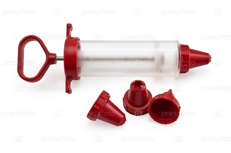 Кондитерский шприц со сменными насадками, на белом фоне