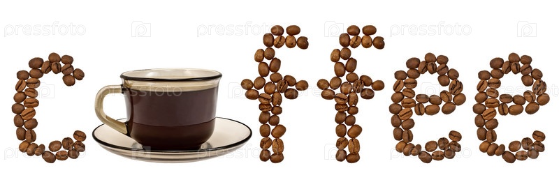 Слово "кофе" из кофейных зерен с чашкой кофе из коричневого стекла, изолированные на белом фоне