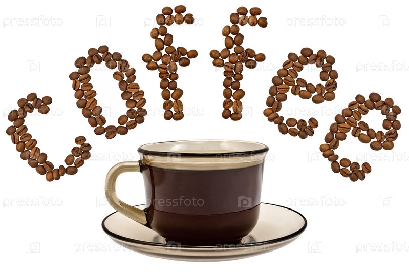 Слово "кофе" из кофейных зерен с чашкой кофе, изолированные на белом фоне