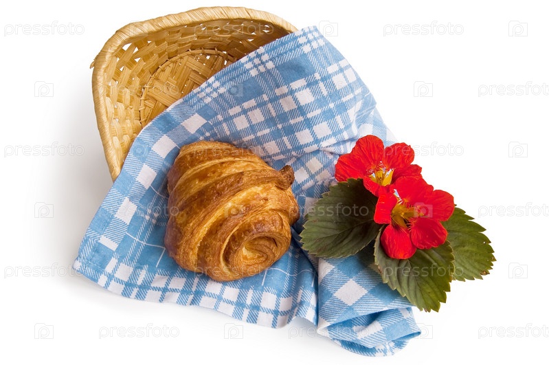 Золотистый круассан на клетчатой голубой салфетке, плетеная корзинка с красными цветами, изолированные на белом фоне