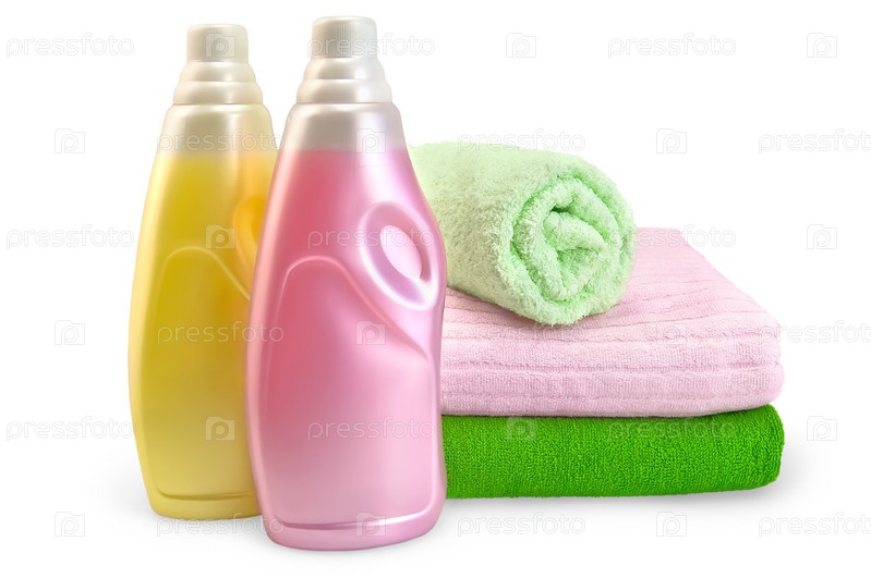Две бутылки ополаскивателя розового и желтого цвета, стопка полотенец, изолированные на белом фоне