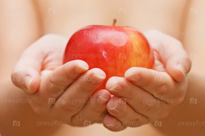 Красное яблоко в женских руках