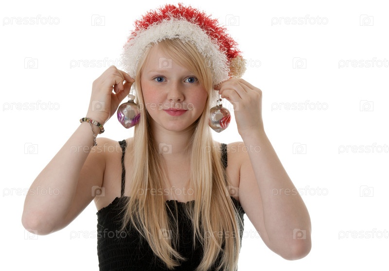 Красивая молодая блондинка в новогодней шапке на белом фоне