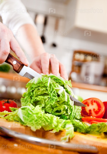 Женщина режет овощи на салат, крупный план