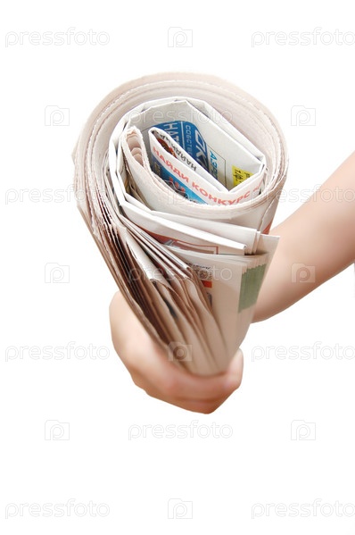 Скрученная газета в человеческой руке на белом фоне