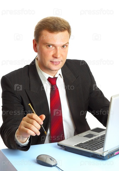 Бизнесмен в костюме сидит за столом с ноутбуком