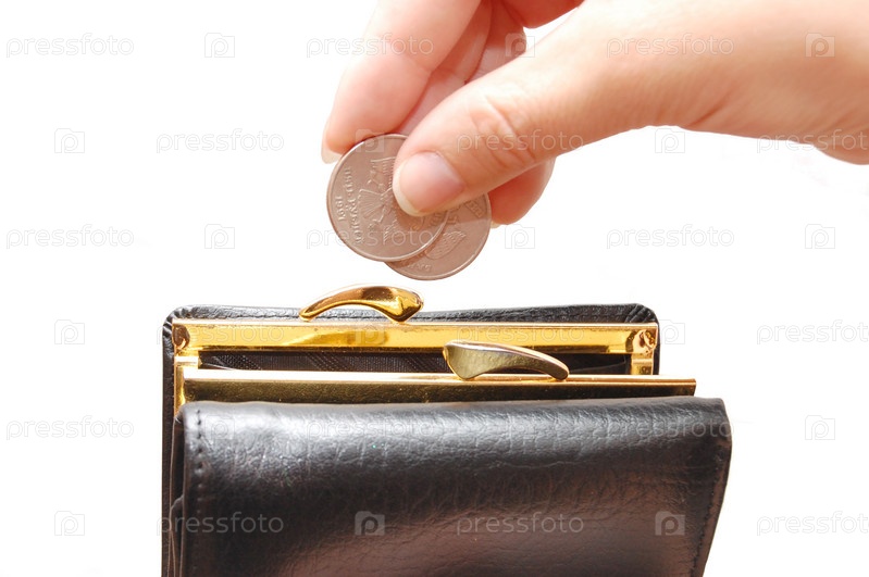 Женская рука опускает денежные монеты в кошелек