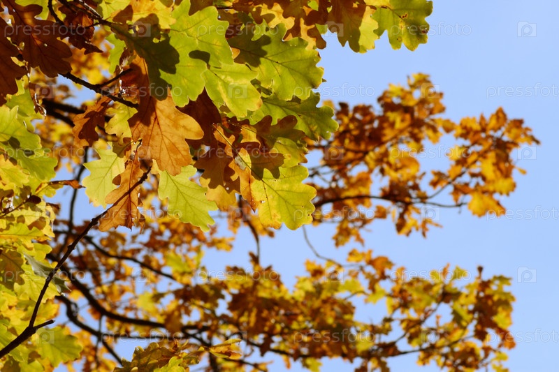 Дубовые листья против голубого неба удалены с близкого расстояния