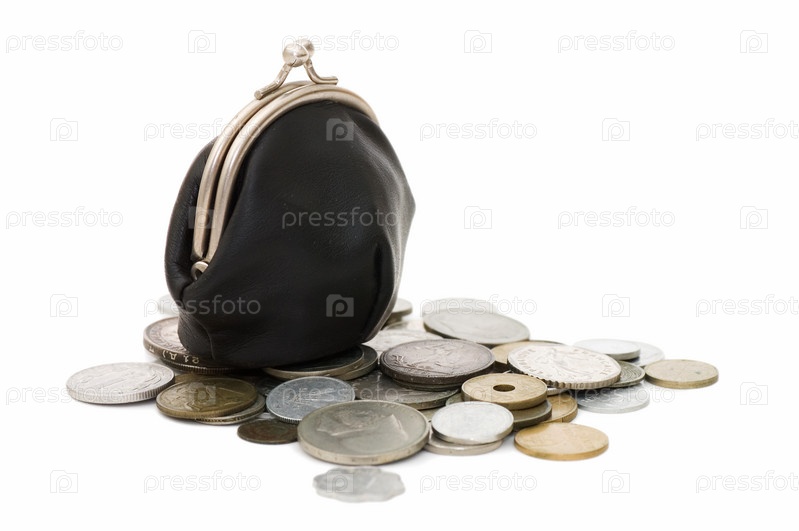 Денежные монеты рассыпаны возле переполненного кошелька