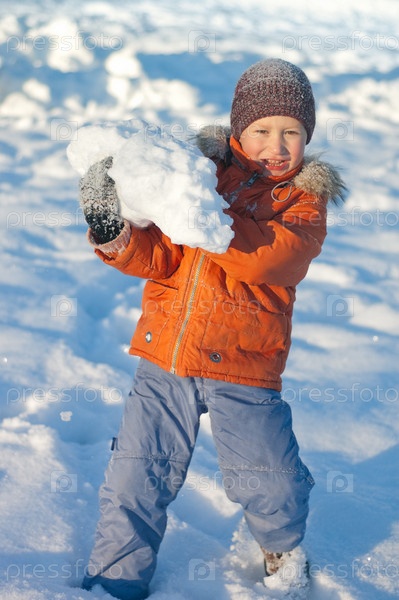 Мальчик держит большой снежный ком