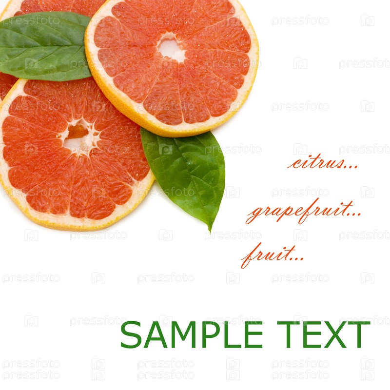 Свежий сочный грейпфрут с зелеными листьями на белом фоне