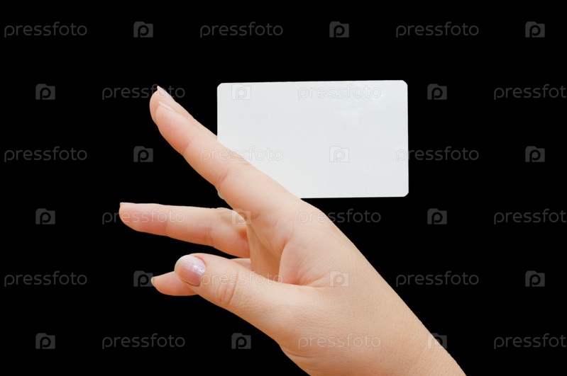 Пустая белая карточка в женской руке на черном фоне