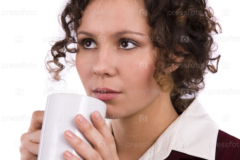 Близкий план молодой бизнес-женщины, пьющей кофе на белом фоне. Бизнес-женщина в перерыве на кофе. Красивая женщина держит чашку кофе. Деловая девушка наслаждается чаем