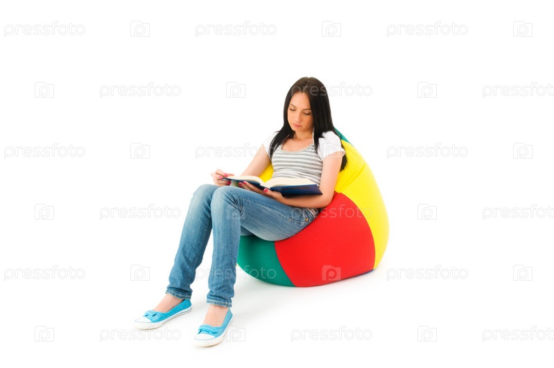 Молодая темноволосая девушка, читающая книгу на белом фоне