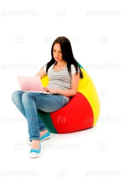 Молодая девушка, работающая на ноутбуке. Изоляция на белом фоне