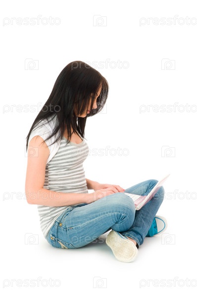 Молодая девушка, работающая на ноутбуке, сидя на полу. Изоляция на белом фоне