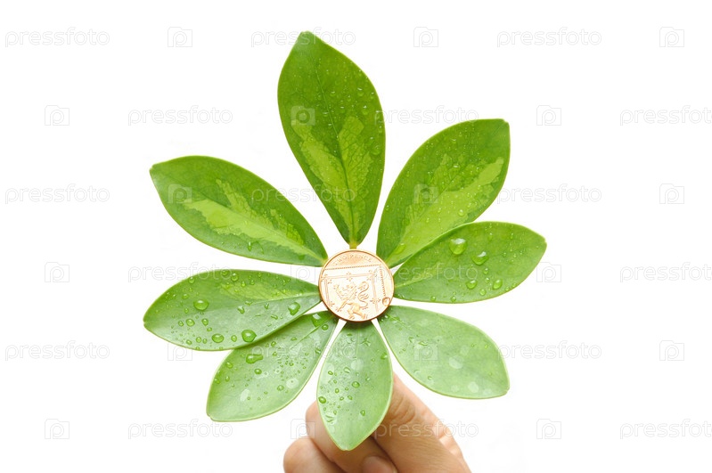 Отросток комнатного растения с монетой крупным планом