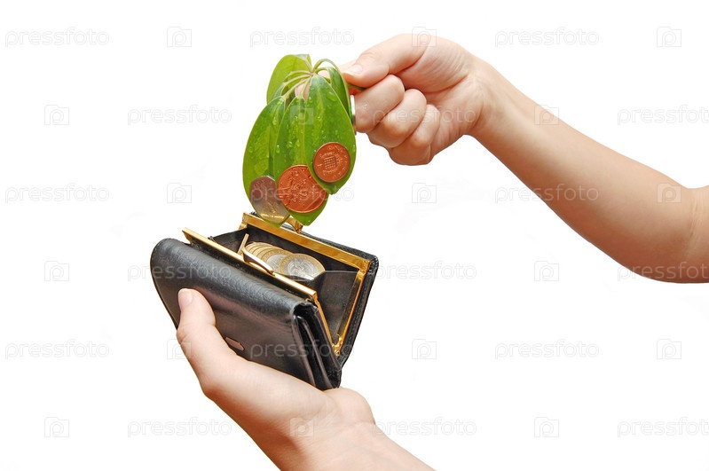 Отросток комнатного растения с монетами на листьях и кошелек с деньгами