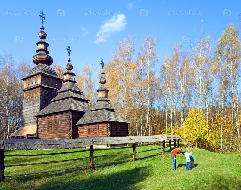 Деревянная старая церковь. Осенний пейзаж