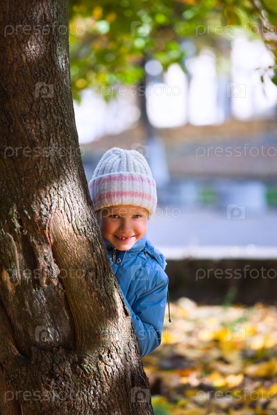 Маленькая девочка в осеннем парке возле большого клена