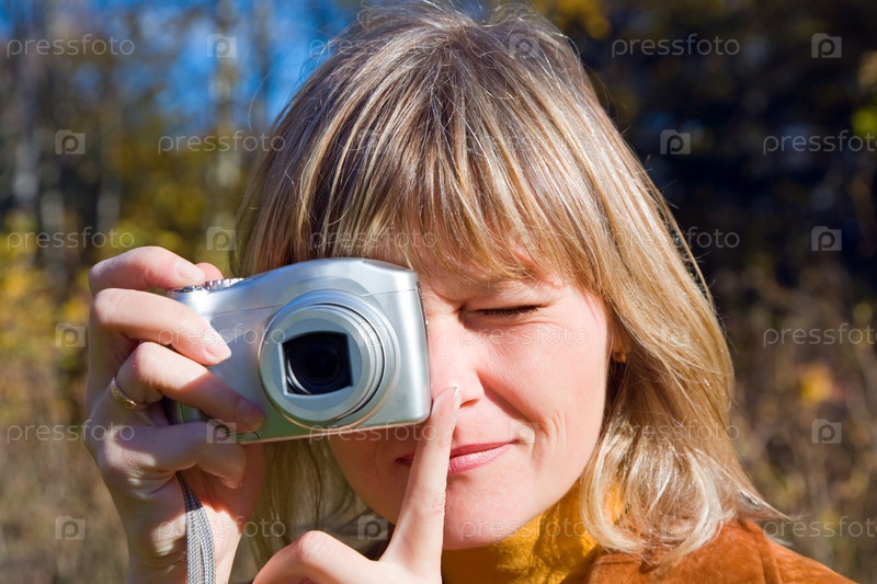 Портрет молодой женщины с фотоаппаратом в осеннем лесу