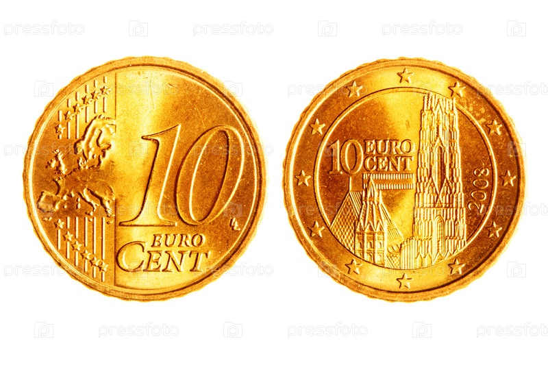 Лицевая и оборотная сторона монеты достоинством 10 евроцентов на белом фоне