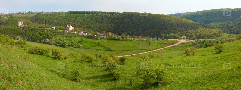 Руины замка на весенних холмах, Украина