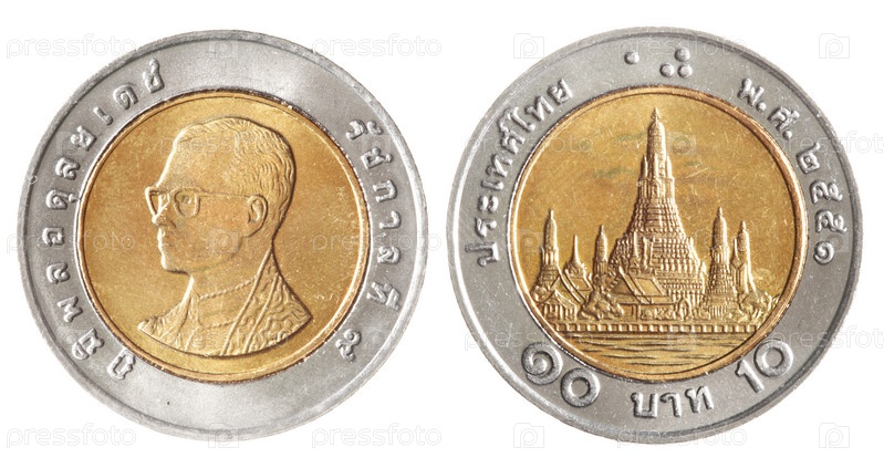 Лицевая и оборотная сторона тайской монеты достоинством 10 батов на белом фоне