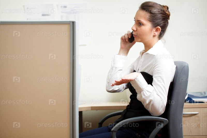 Молодая девушка разговаривает по телефону в офисе