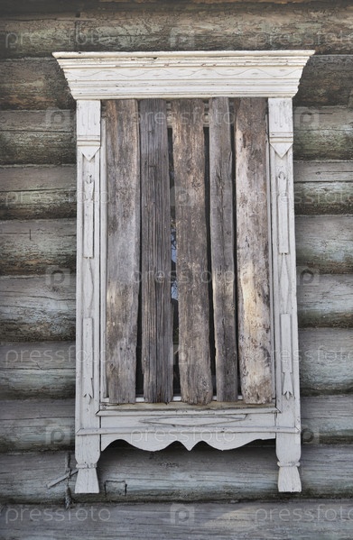 Старое заколоченное окно в деревянном заброшенном доме