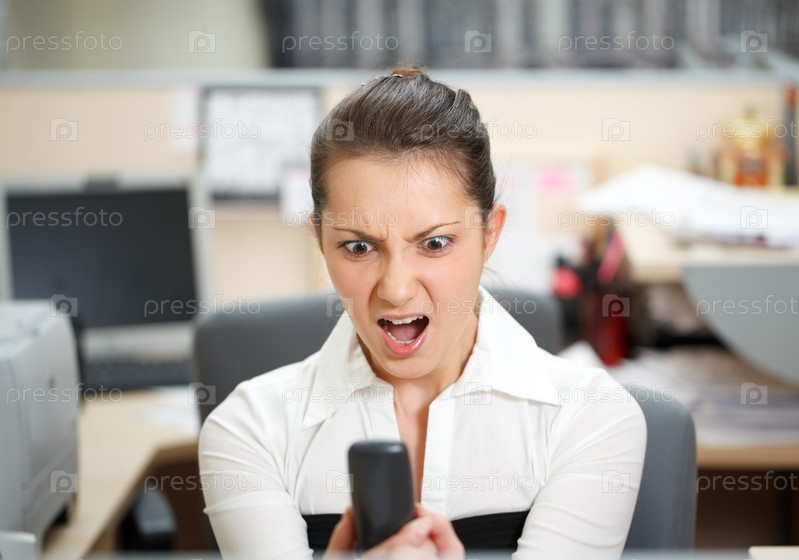 Разозлившаяся девушка смотрит на телефон