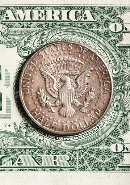 Монета достоинством 50 центов на долларовой банкноте