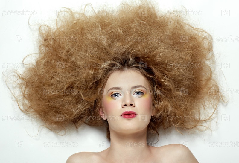 Портрет молодой девушки с пышной прической, которая лежит на полу