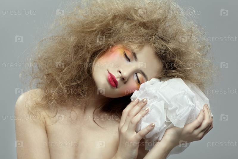 Портрет молодой девушки с пышной прической, которая держит в руках клубок белой ткани