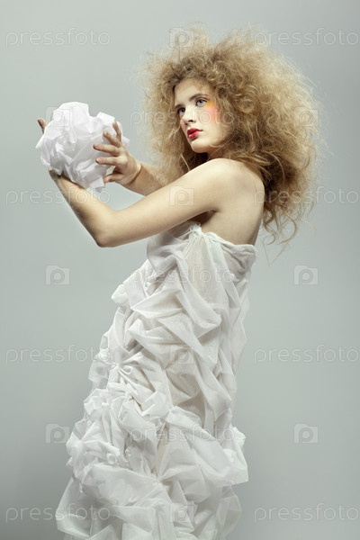 Молодая девушка с пышной прической, которая держит в руках клубок белой ткани