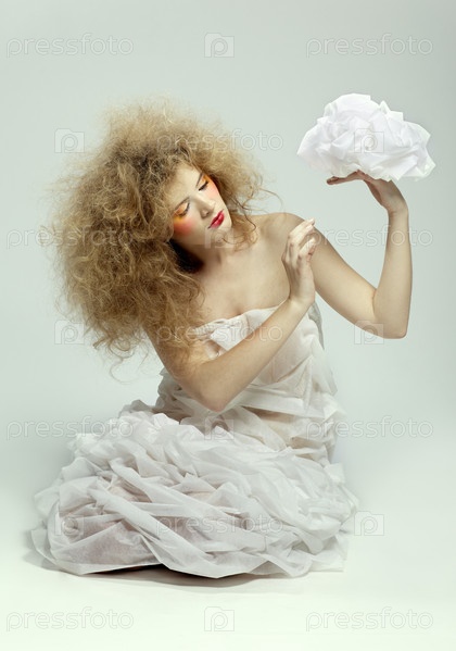 Молодая девушка с пышной прической, которая держит в руках клубок белой ткани