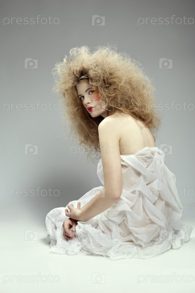 Молодая девушка с пышной прической в белом драпированном платье