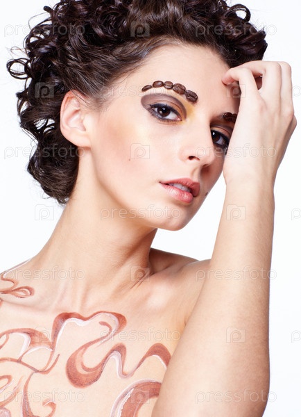 Портрет девушки, боди-арт которой выполнен в стиле кофе
