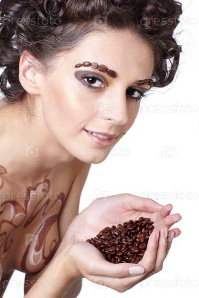 Портрет девушки, боди-арт которой выполнен в стиле кофе