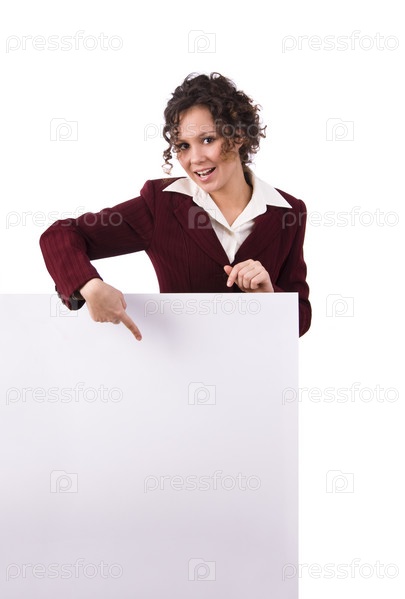Портрет счастливой бизнес-жены, указывающей на белую пустую карточку на изолированном белом фоне