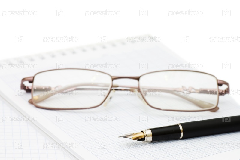 Очки и перьевая авторучка лежат на чистом листе блокнота на белом фоне