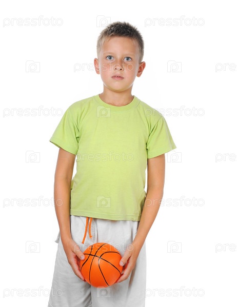 Молодой мальчик держит баскетбольный мяч на эхите фоне