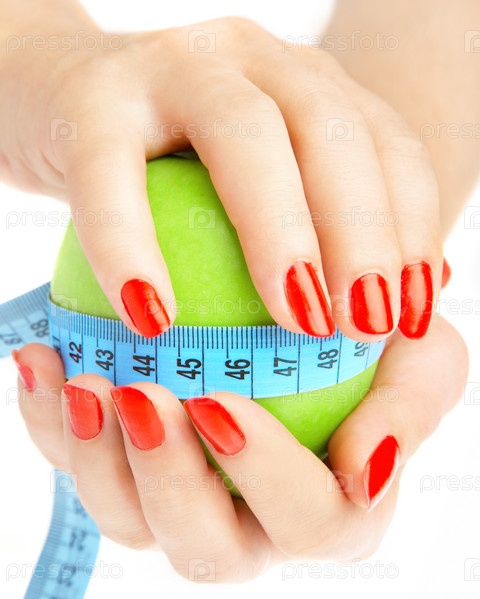 Яблоко, обмотанное сантиметровой лентой, в женских руках