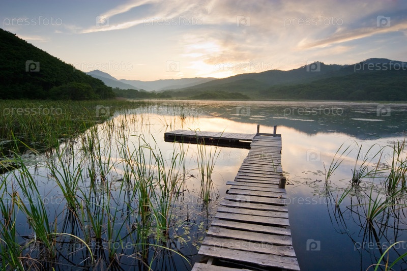 Покосившийся деревянный мост на заросшем озере