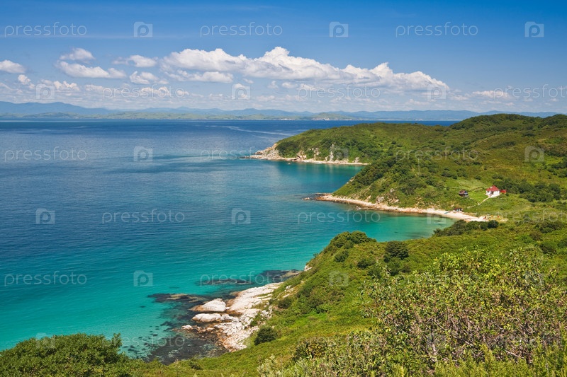 Травянистый берег и тонкая полоска пляжа у синего моря