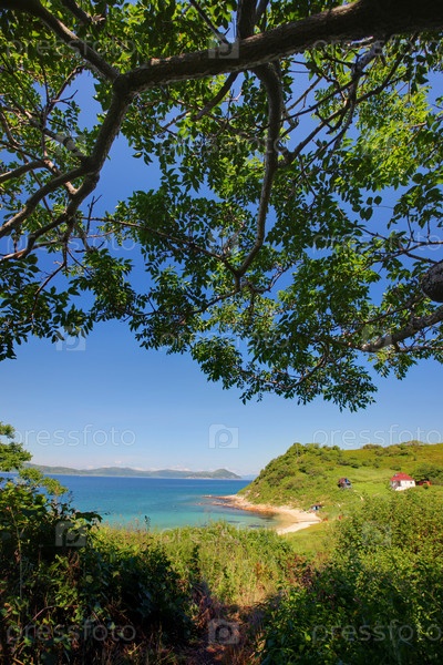 Изумрудный лес у побережья Японского моря на фоне голубого неба